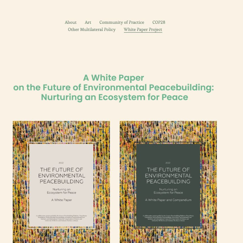 The White Paper is a collaborative, multi-author project which outlines a vision for the future of environmental peacebuilding. The process is designed to act as a vehicle through which stakeholders may collaborate and build cross-cutting relationships in order to craft a common vision for the future. It also recognises the variety of perspectives and backgrounds present in the environment, climate, conservation, conflict, security, and peace fields. The White Paper is a policy-oriented document, to be developed through a reflective, consultative, multi-stakeholder process. It delivered a strong, cogent message about the future of the field to the Stockholm+50 forum in June 2022. The White Paper project launched to the public on 1 February 2022. Find the White Paper and Compendium here.